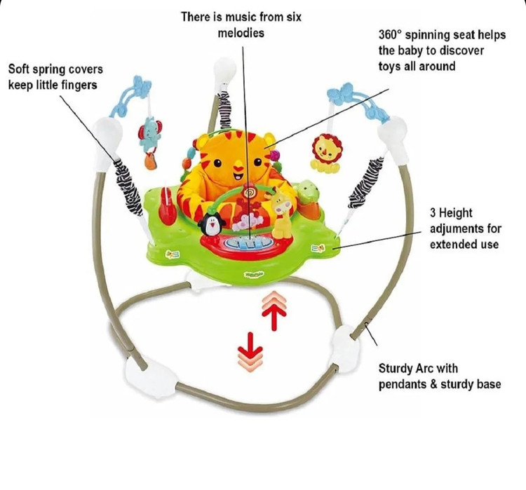 سرگرمی و آموزش: این جامپر با اسباببازیهای فراوان و رنگارنگ، کودک را ساعتها سرگرم میکند. موزیک و نور آن با بالا و پایین پریدن کودک فعال میشوند که به تقویت حس شنوایی و بینایی او کمک میکند.